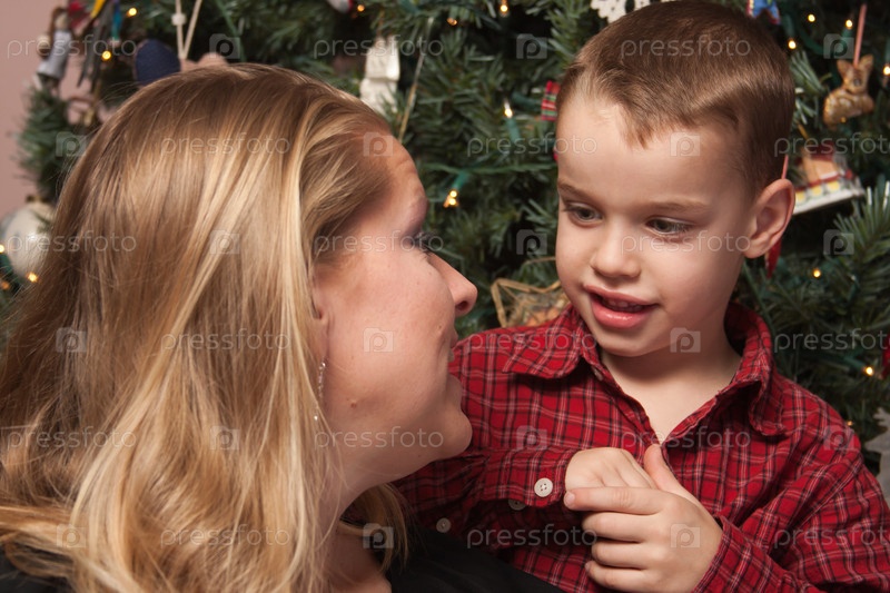 Очаровательный сын говорит с матерью у новогодней елки