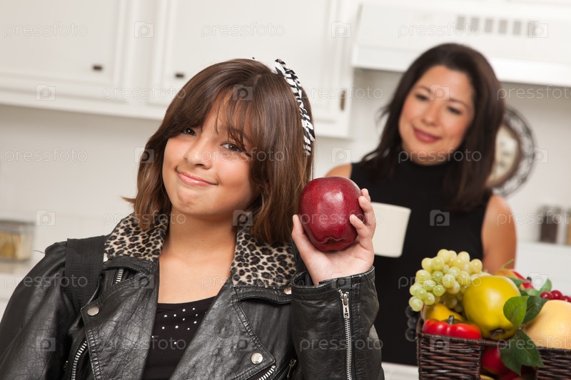 Симпатичная девочка собирается в школу с матерью