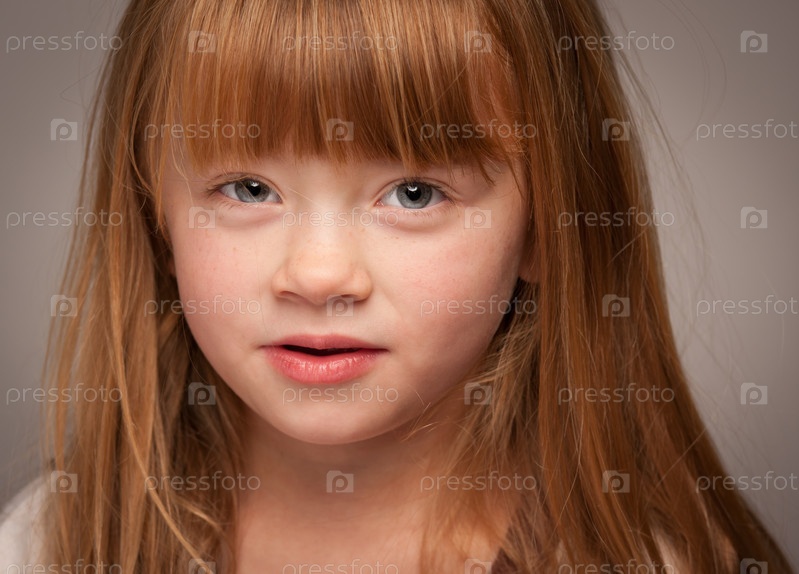 Портрет веселой очаровательной ражеволосой девочки на сером фоне