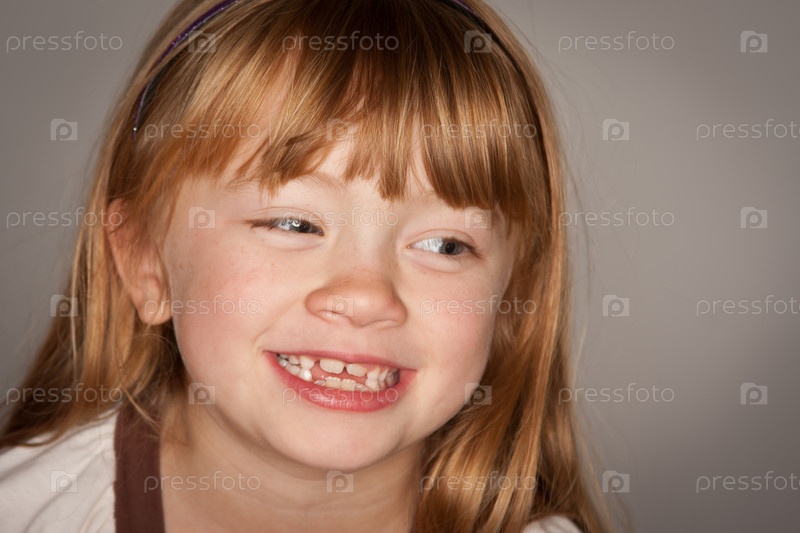 Портрет веселой очаровательной ражеволосой девочки на сером фоне