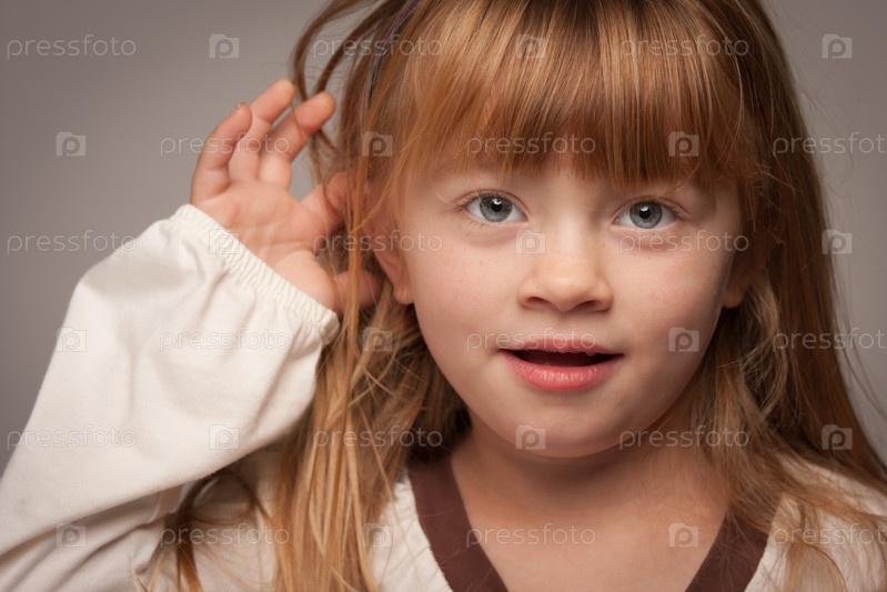 Портрет веселой очаровательной ражеволосой девочки на сером фоне