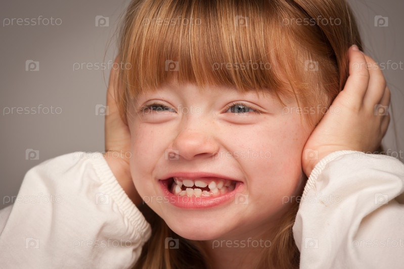 Портрет веселой очаровательной ражеволосой девочки на сером фоне
