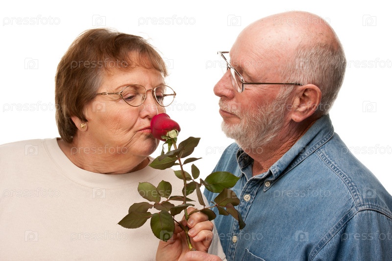 Счастливый пожилой мужчина дарит жене красную розу