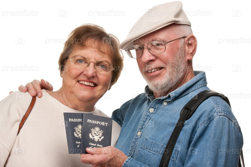 Счастливая пожилая пара с паспортами и сумками на белом фоне