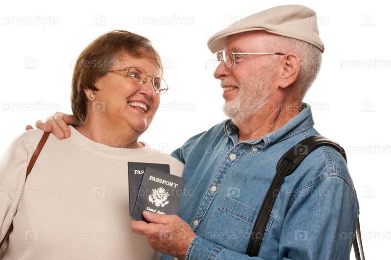 Счастливая пожилая пара с паспортами и сумками на белом фоне
