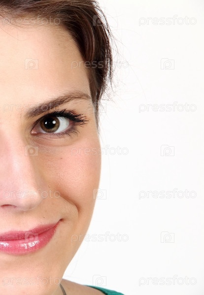 Обрезанное изображение улыбающегося женского лица на белом фоне