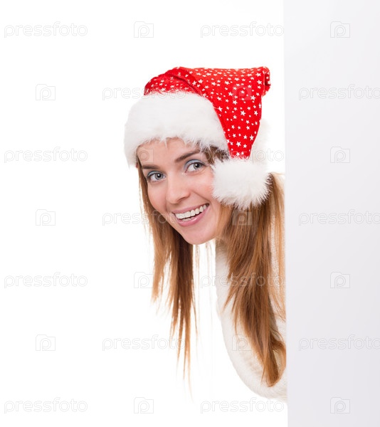 Молодая женщина в колпаке Санта-Клауса с баннером