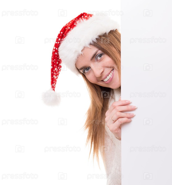 Молодая женщина в колпаке Санта-Клауса с баннером