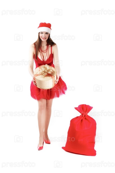 Привлекательная женщина в костюме Санты с подарком