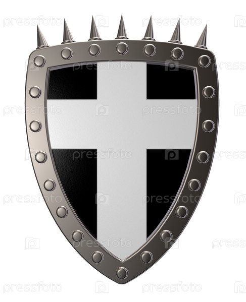 Металлический щит с христианским крестом на белом фоне - 3d иллюстрация