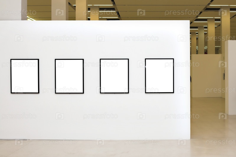 Выставка в музее с четырьмя пустыми рамками на белых стенах