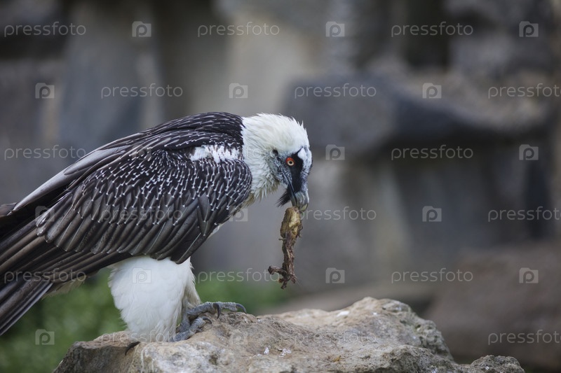 Стервятник-бородач ест мясо на скале