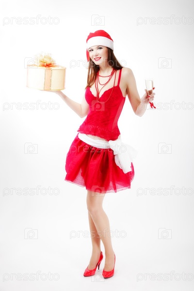 Привлекательная женщина в рождественском костюме предлагает подарок