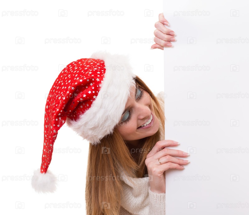 Молодая женщина в шапке Санта-Клауса с баннером