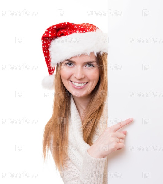 Молодая женщина в шапке Санта-Клауса с баннером