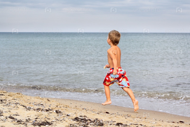 Маленький мальчик бежит по берегу моря