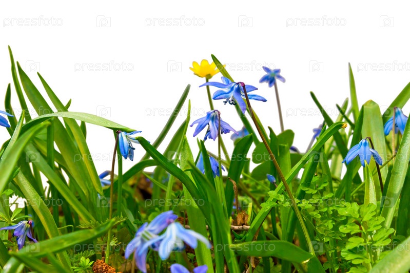 Лесные дикие цветы и травы. Голубые подснежники, изолированные на белом фоне