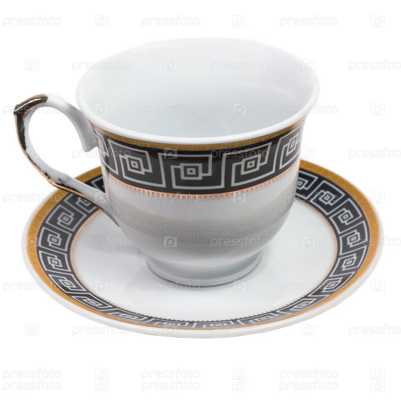 Английская чашка с блюдцем, украшенные античным орнаментом, изолированные с путем отсечения