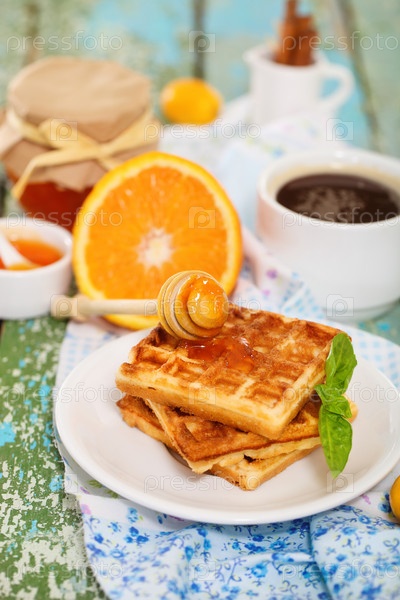 Вкусный завтрак со свежим кофе, свежими вафлями и фруктами