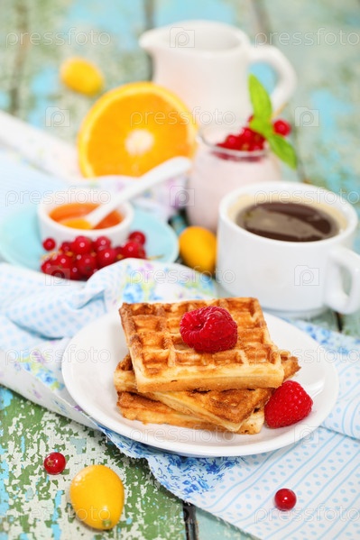 Вкусный завтрак со свежим кофе, свежими вафлями и фруктами