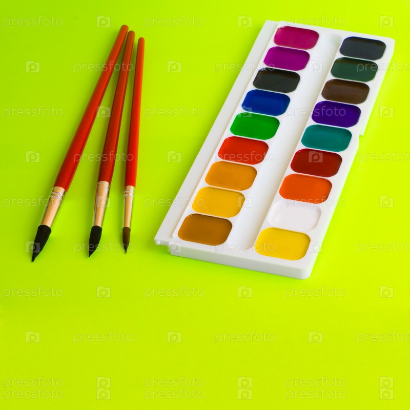 Краски и кисти на зеленом фоне
