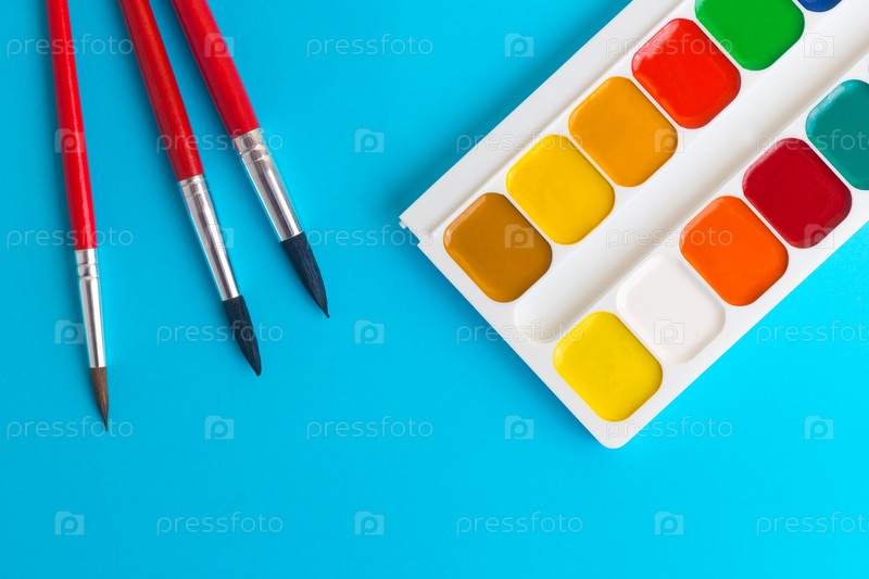 Краски и кисти на синем фоне