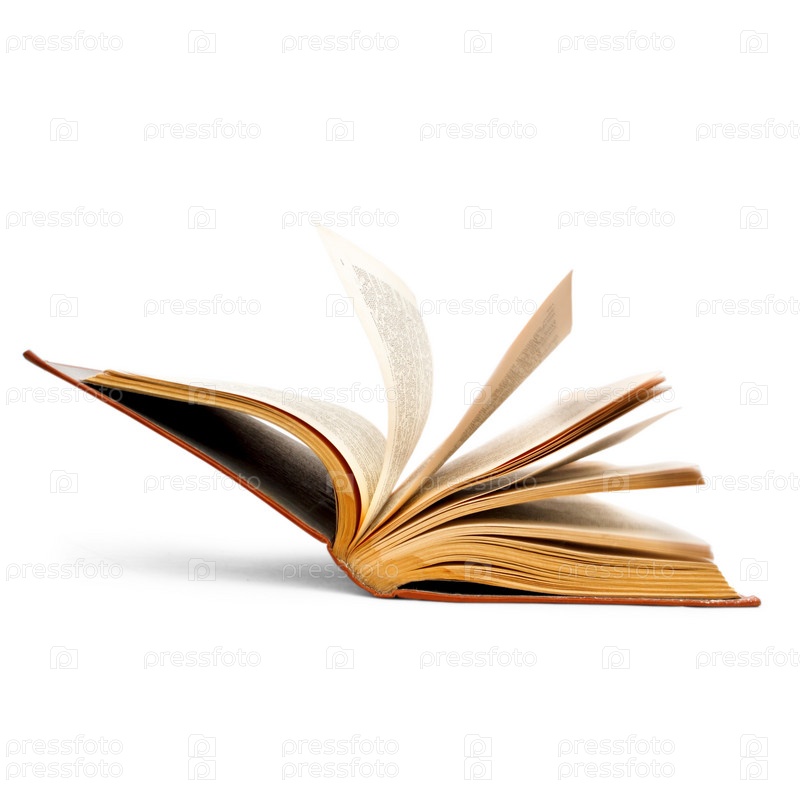 Старая открытая книга с перелистываемыми страницами, изолированная на белом фоне с путем отсечения