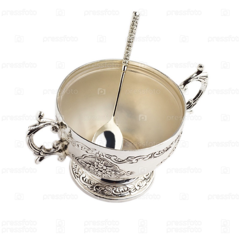 Старая средневековая чаша и ложка, изолированные на белом фоне