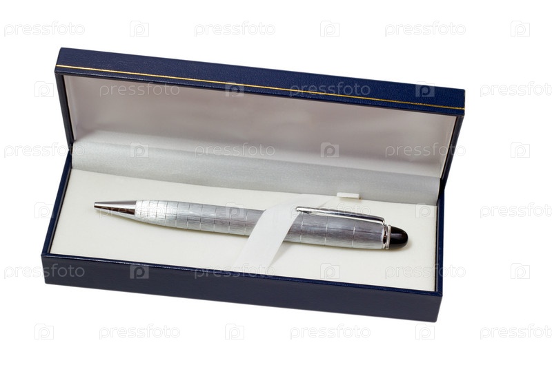 Серебристая шариковая ручка в подарочной коробке, изолированная на белом фоне с путем отсечения