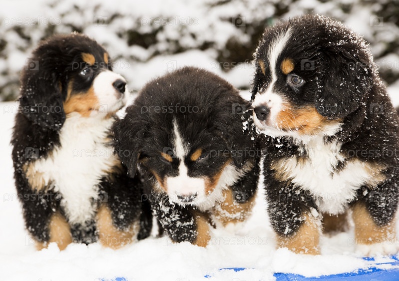 Щенки бернского зенненхунда в снегу