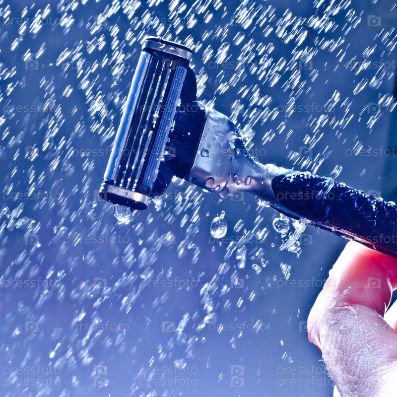 Бритва на синем фоне с брызгами воды