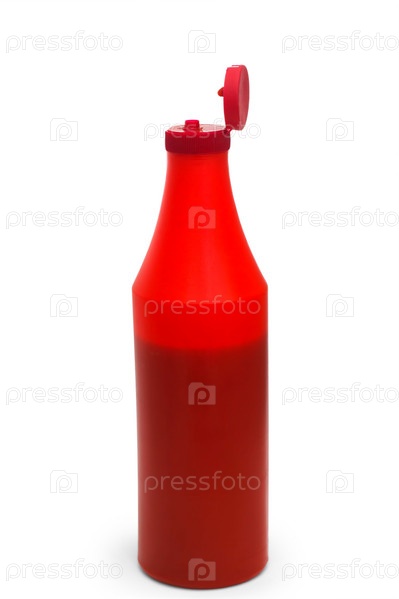 Красная пластиковая бутылка кетчупа, изолированная на белом фоне