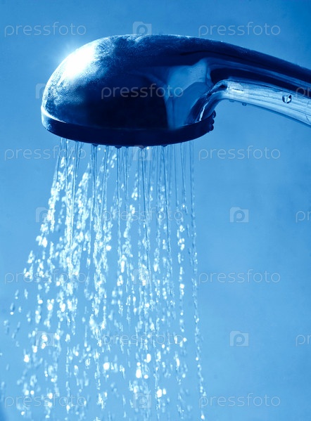 Брызги воды из душа на синем фоне