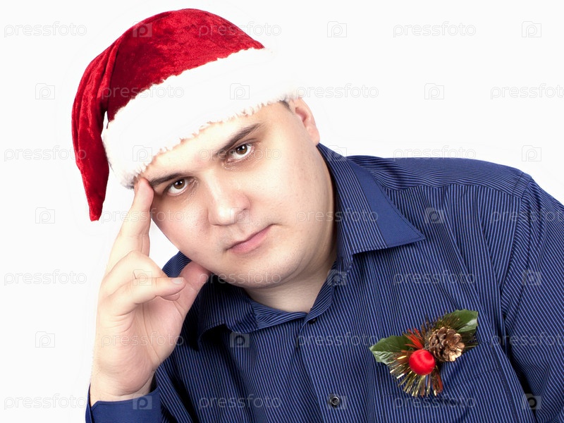 Мужчина в синей рубашке и шапке Санта-Клауса