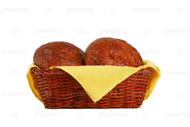 Свежий румяный хлеб лежит в корзинке на белом фоне