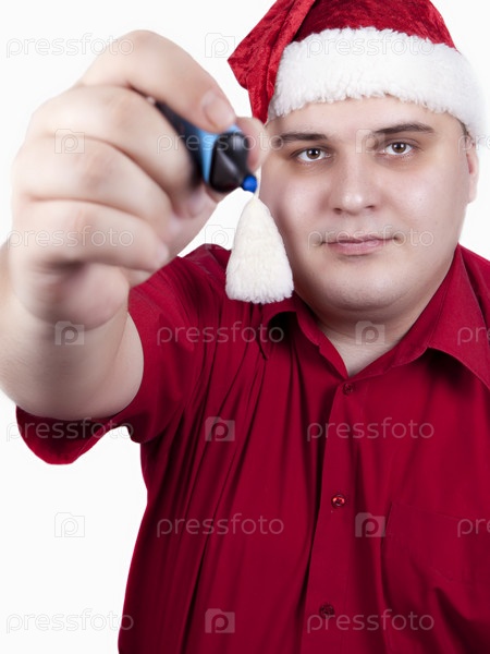 Мужчина в красной рубашке и шапке Санта-Клауса