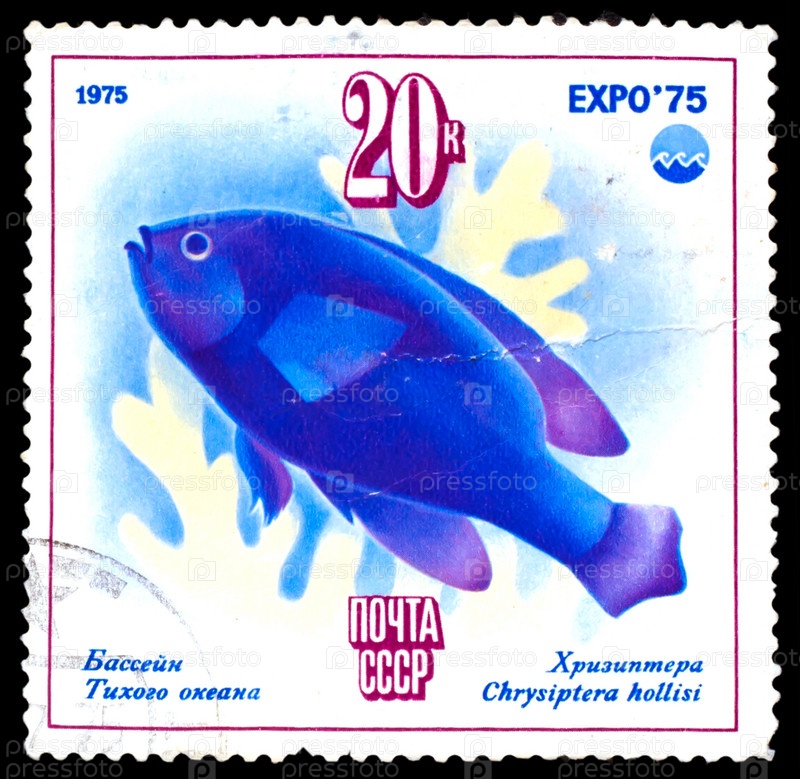 СССР, 1975 г. Марка с хризиптерой, сhrysiptera hollisi из серии Океан Экспо-75