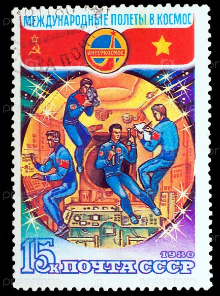 Марка СССР 1980 года. Международные полеты в космос, астронавты проводят исследования в космосе на космической станции