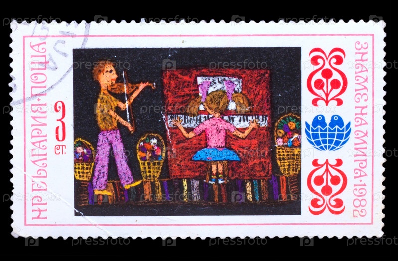 Болгарская марка 1982 года. Девушка играет на фортепиано и мальчик играет на скрипке