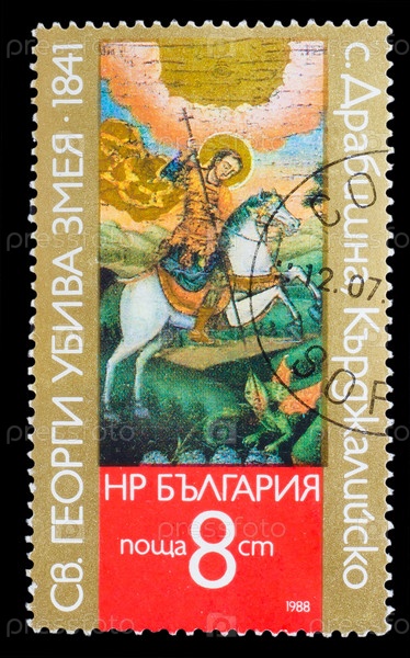 Болгария, марка 1988 года, картина Драбишна Карджали «Георгий убивает дракона»