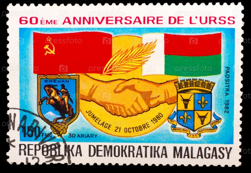 Марка, напечатанная в Малагасии, демократическая Республика Мадагаскара, советский и малагасийский флаг, рукопожатие, 1982 год