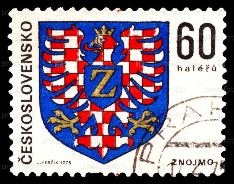 Чехословацкая марка 1975 года. Герб Зноймо с орлом в красную клетку