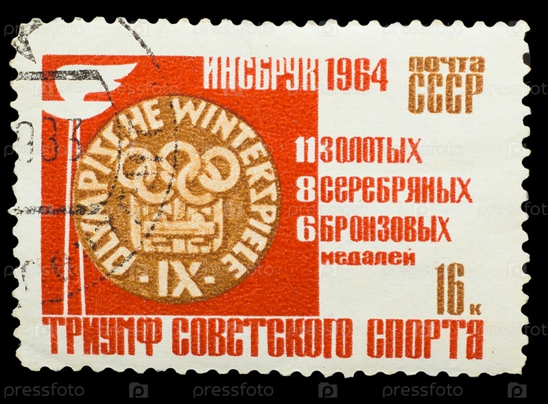 Марка СССР 1964 года. Медаль с надписью «Иннсбрук, 1964», Советский спортивный триумф - 11 золотых, 8 серебряных, 6 бронзовых медалей