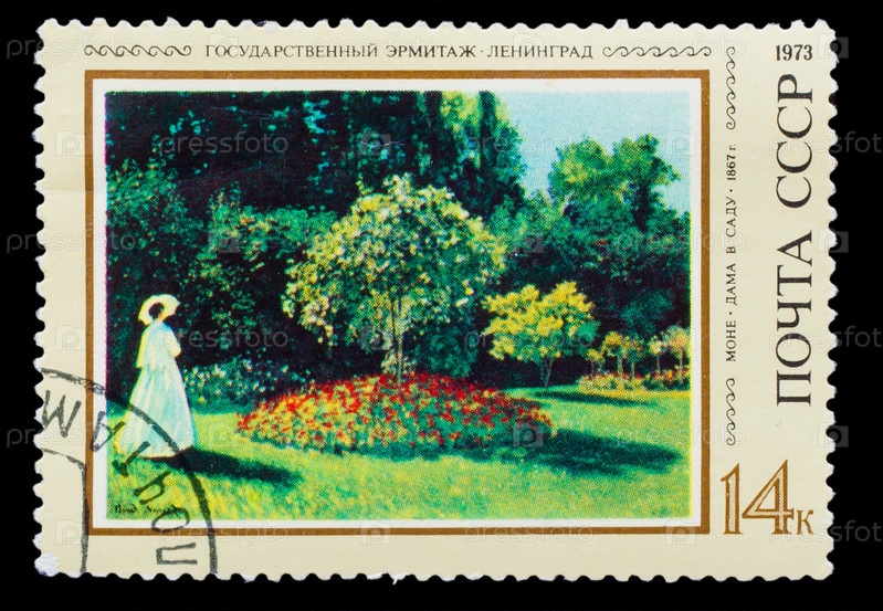 Марка СССР 1973 года. Художник Моне, Дама в саду, 1867, Государственный Эрмитаж, Санкт-Петербург