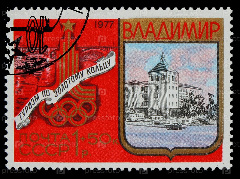 Марка СССР 1977 года. Туризм в городах Золотого кольца, Владимир, общий вид улицы и движущийся мимо здания автомобиль