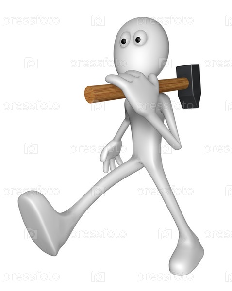 Маленький белый человек с большим молотком. 3D иллюстрация