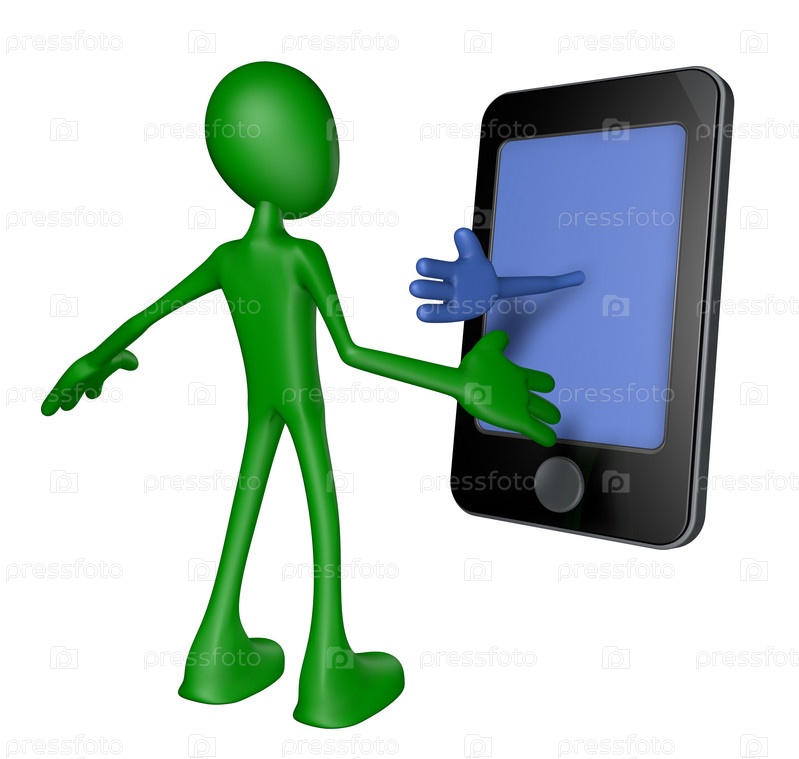 Смартфон с рукой на дисплее и удивленный зеленый человек. 3d иллюстрация