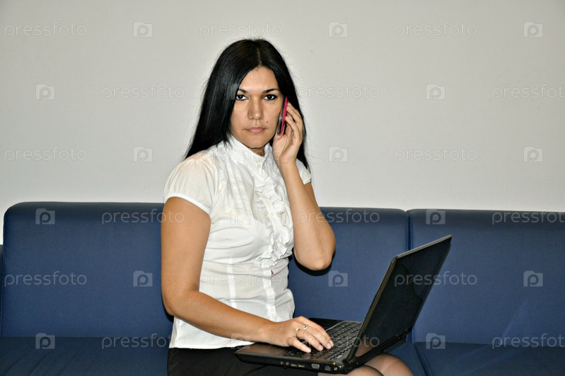 Деловая девушка работает на ноутбуке с телефоном в руке