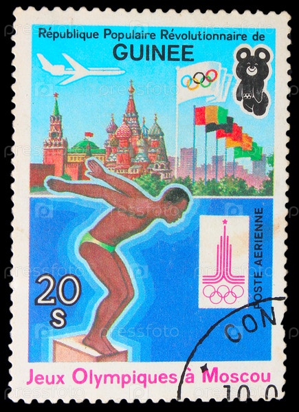 Гвинея, марка 1980 года, посвященная Олимпийским играм, Москва 1980, плавание, спортсмен прыгает в воду