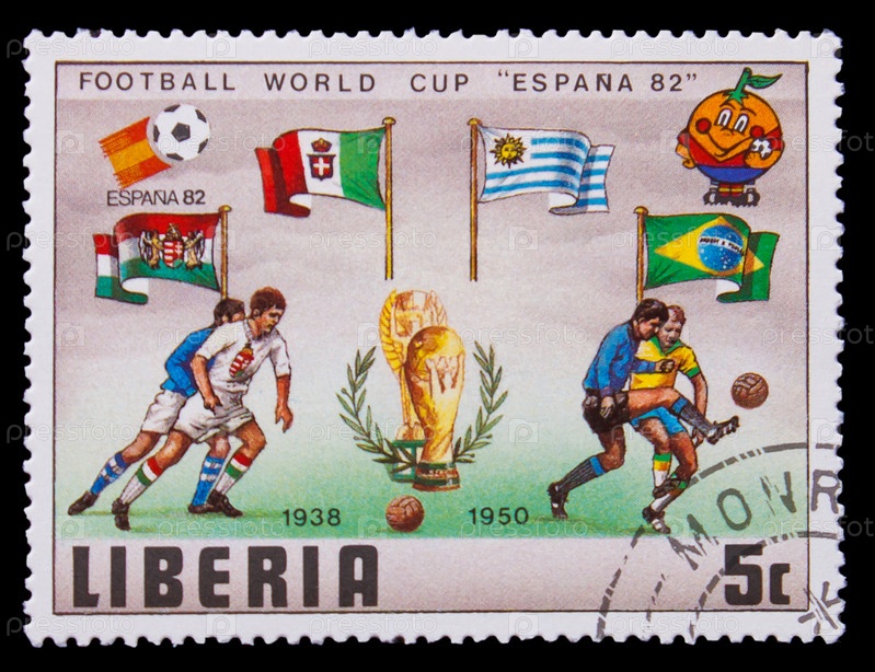 Либерия, марка 1982 года, Аргентинские и Итальянские флаги на чемпионате мира по футболу и трофей